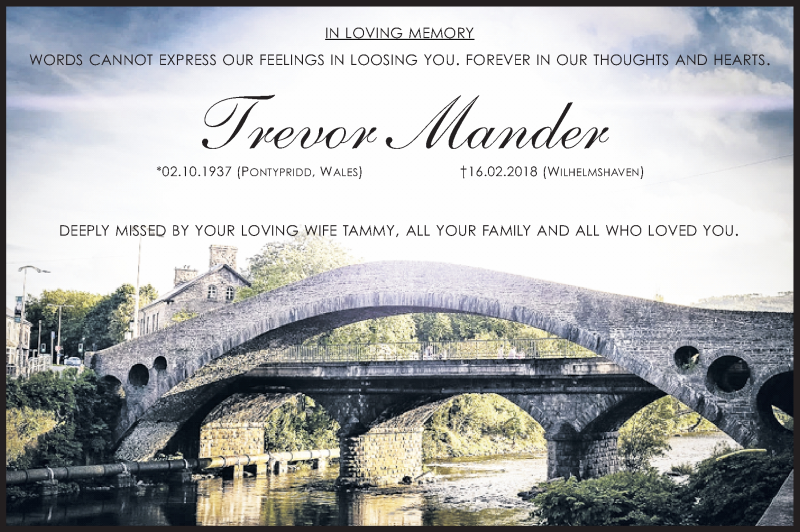 Hier finden Sie alle Traueranzeigen aus der Zeitung, die bisher für Trevor Mander erschienen sind. Weitere Traueranzeigen, die in der Zeitung erscheinen, werden hier ebenfalls aufgelistet