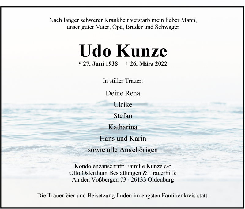 Hier finden Sie alle Traueranzeigen aus der Zeitung, die bisher für Udo Kunze erschienen sind. Weitere Traueranzeigen, die in der Zeitung erscheinen, werden hier ebenfalls aufgelistet