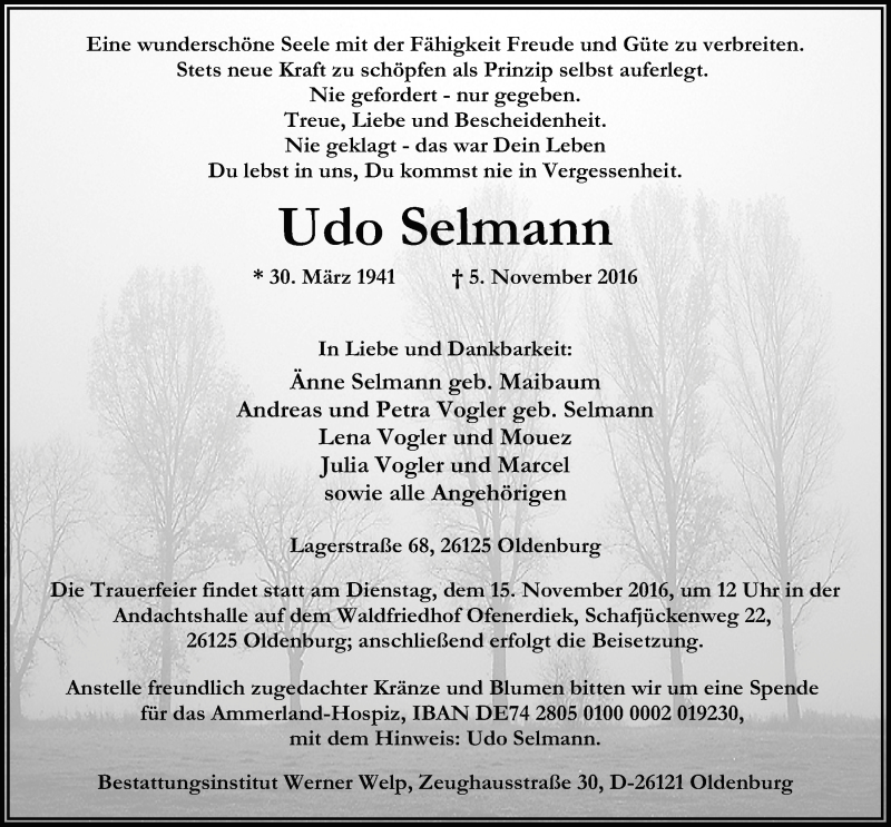 Hier finden Sie alle Traueranzeigen aus der Zeitung, die bisher für Udo Selmann erschienen sind. Weitere Traueranzeigen, die in der Zeitung erscheinen, werden hier ebenfalls aufgelistet