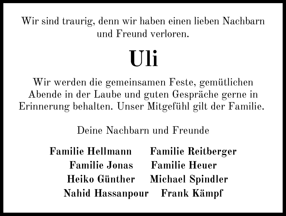 Hier finden Sie alle Traueranzeigen aus der Zeitung, die bisher für Uli Ackert erschienen sind. Weitere Traueranzeigen, die in der Zeitung erscheinen, werden hier ebenfalls aufgelistet