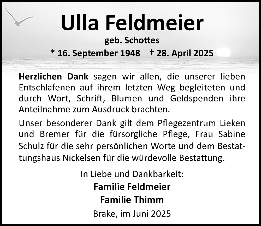 Hier finden Sie alle Traueranzeigen aus der Zeitung, die bisher für Ulla Feldmeier erschienen sind. Weitere Traueranzeigen, die in der Zeitung erscheinen, werden hier ebenfalls aufgelistet