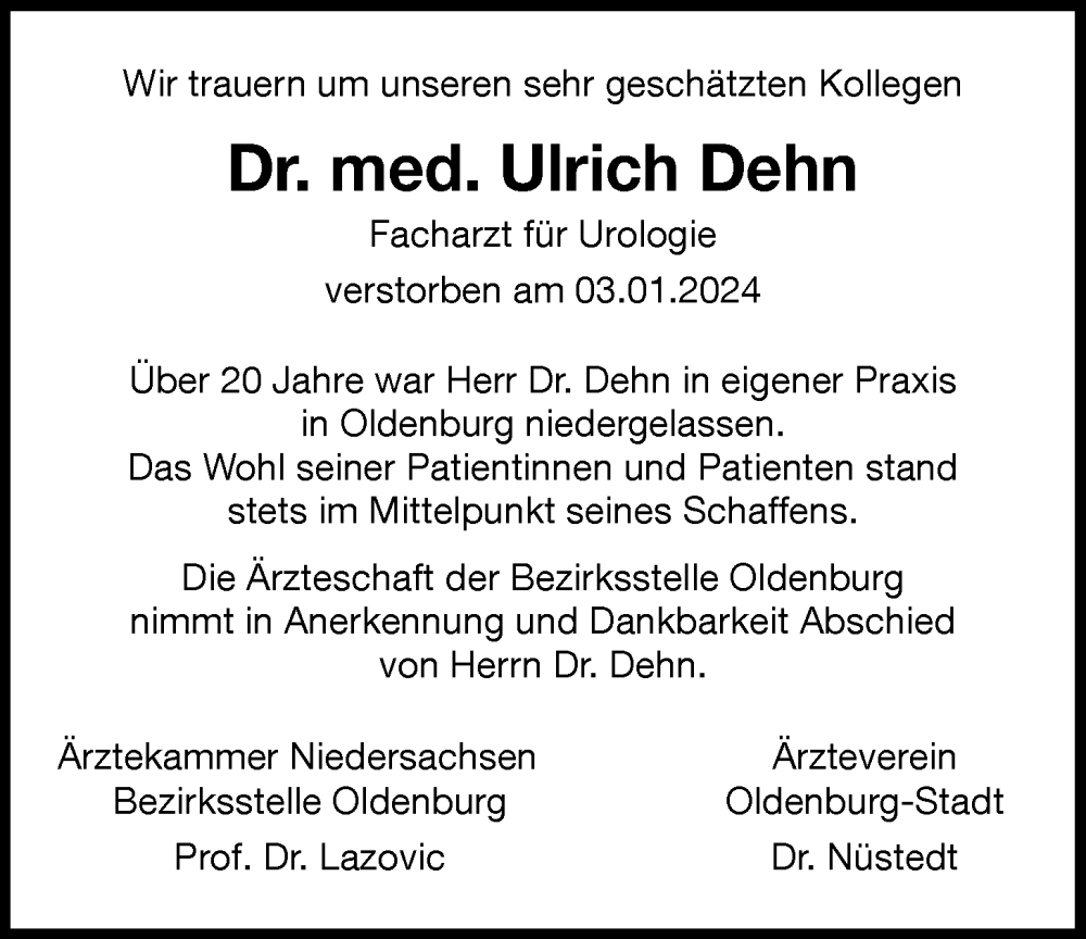 Hier finden Sie alle Traueranzeigen aus der Zeitung, die bisher für Ulrich Dehn erschienen sind. Weitere Traueranzeigen, die in der Zeitung erscheinen, werden hier ebenfalls aufgelistet