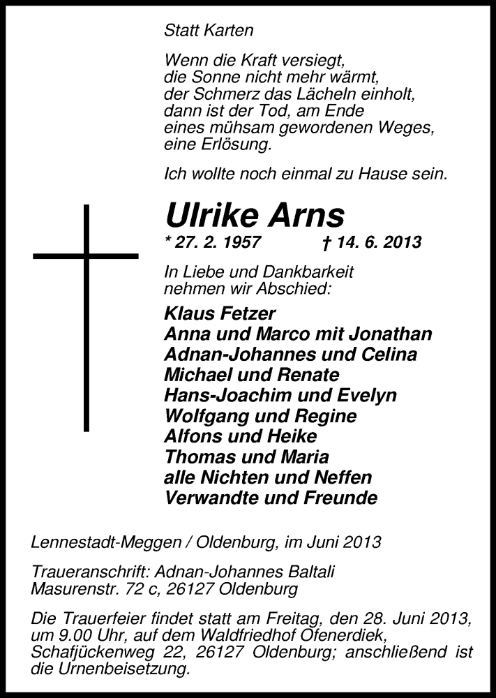 Hier finden Sie alle Traueranzeigen aus der Zeitung, die bisher für Ulrike Arns erschienen sind. Weitere Traueranzeigen, die in der Zeitung erscheinen, werden hier ebenfalls aufgelistet