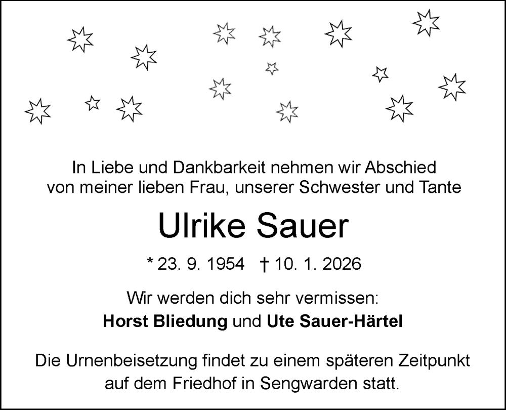 Hier finden Sie alle Traueranzeigen aus der Zeitung, die bisher für Ulrike Sauer erschienen sind. Weitere Traueranzeigen, die in der Zeitung erscheinen, werden hier ebenfalls aufgelistet