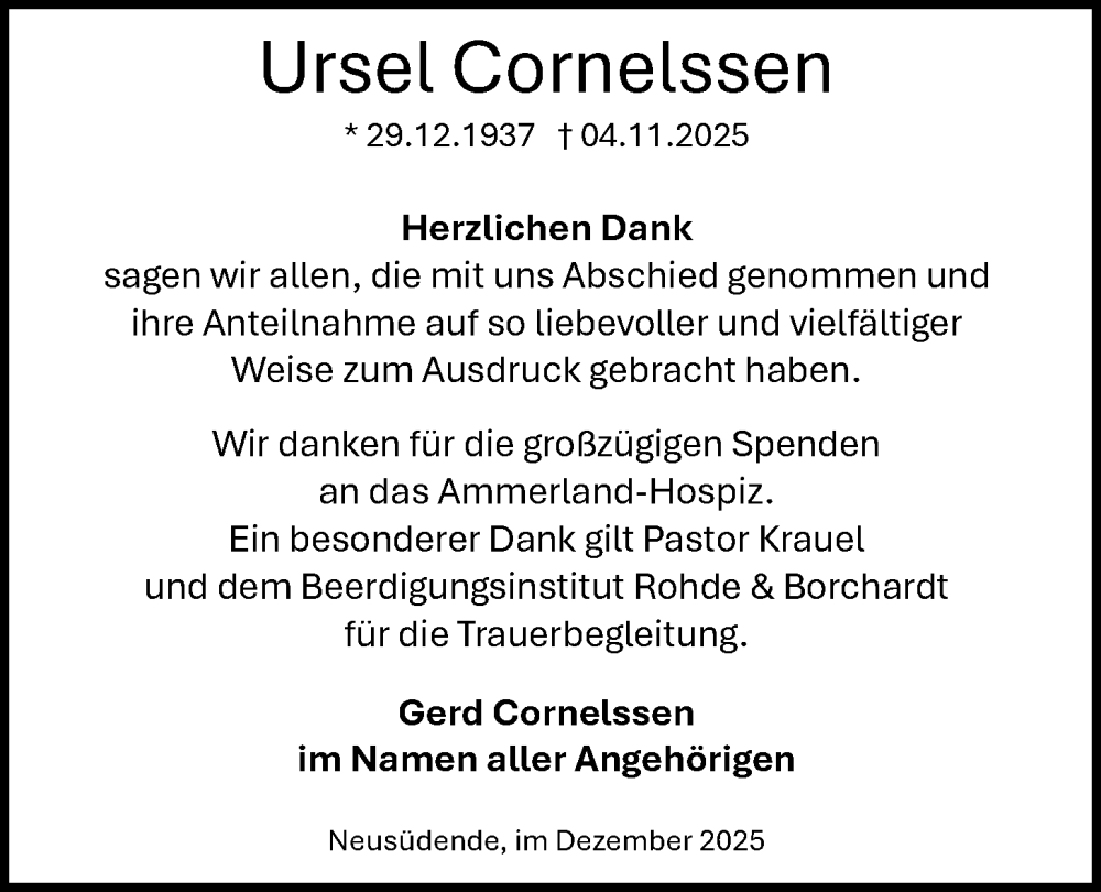 Hier finden Sie alle Traueranzeigen aus der Zeitung, die bisher für Ursel Cornelssen erschienen sind. Weitere Traueranzeigen, die in der Zeitung erscheinen, werden hier ebenfalls aufgelistet