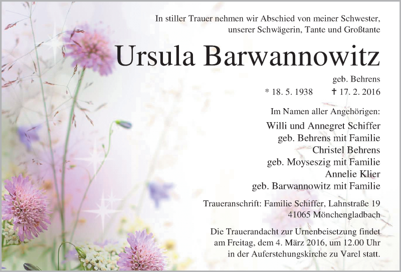 Hier finden Sie alle Traueranzeigen aus der Zeitung, die bisher für Ursula Barwannowitz erschienen sind. Weitere Traueranzeigen, die in der Zeitung erscheinen, werden hier ebenfalls aufgelistet