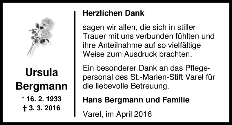 Hier finden Sie alle Traueranzeigen aus der Zeitung, die bisher für Ursula Bergmann erschienen sind. Weitere Traueranzeigen, die in der Zeitung erscheinen, werden hier ebenfalls aufgelistet