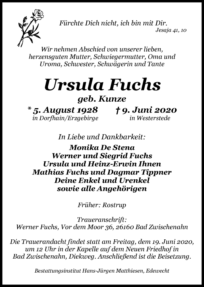 Hier finden Sie alle Traueranzeigen aus der Zeitung, die bisher für Ursula Fuchs erschienen sind. Weitere Traueranzeigen, die in der Zeitung erscheinen, werden hier ebenfalls aufgelistet