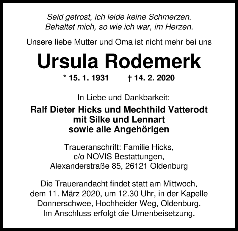 Hier finden Sie alle Traueranzeigen aus der Zeitung, die bisher für Ursula Rodemerk erschienen sind. Weitere Traueranzeigen, die in der Zeitung erscheinen, werden hier ebenfalls aufgelistet