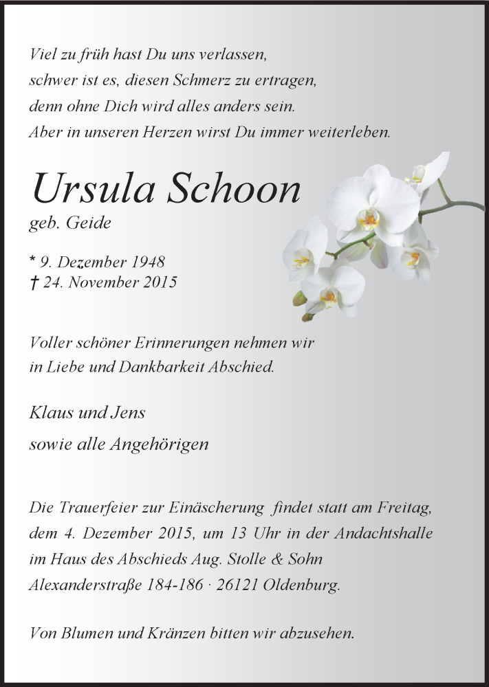 Hier finden Sie alle Traueranzeigen aus der Zeitung, die bisher für Ursula Schoon erschienen sind. Weitere Traueranzeigen, die in der Zeitung erscheinen, werden hier ebenfalls aufgelistet