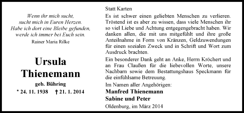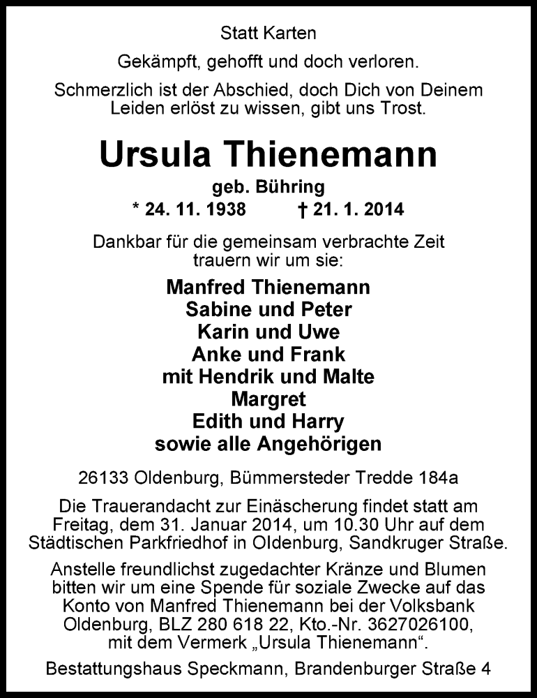 Hier finden Sie alle Traueranzeigen aus der Zeitung, die bisher für Ursula Thienemann erschienen sind. Weitere Traueranzeigen, die in der Zeitung erscheinen, werden hier ebenfalls aufgelistet