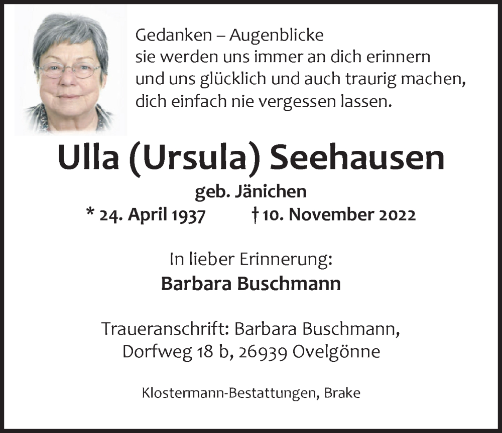 Hier finden Sie alle Traueranzeigen aus der Zeitung, die bisher für Ursula (Ulla) Seehausen erschienen sind. Weitere Traueranzeigen, die in der Zeitung erscheinen, werden hier ebenfalls aufgelistet