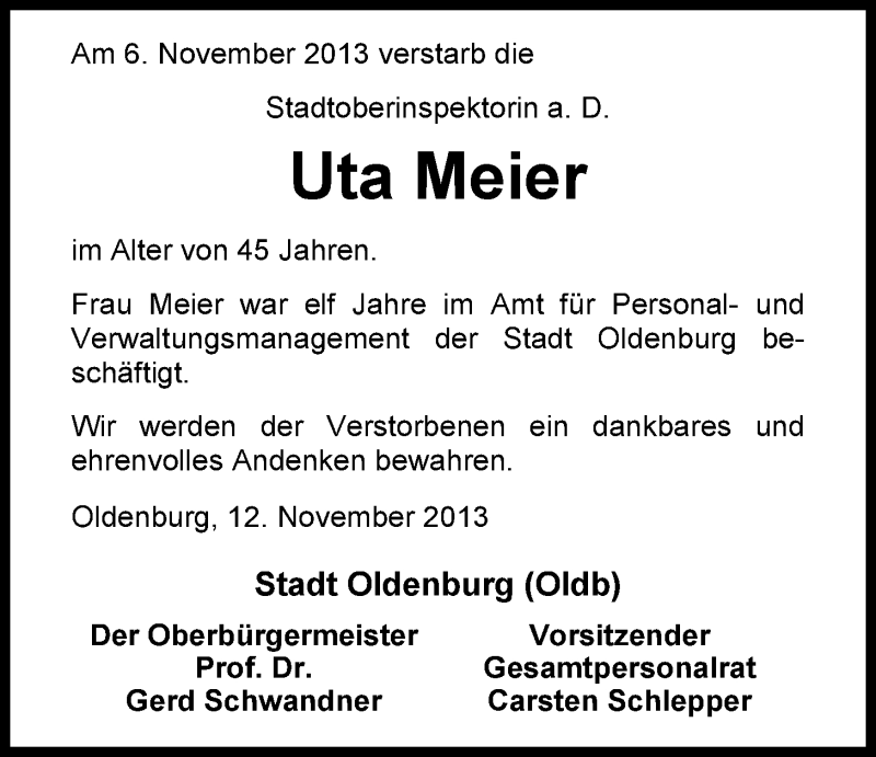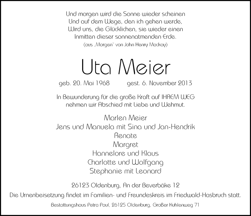 Hier finden Sie alle Traueranzeigen aus der Zeitung, die bisher für Uta Meier erschienen sind. Weitere Traueranzeigen, die in der Zeitung erscheinen, werden hier ebenfalls aufgelistet
