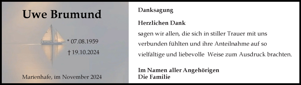 Hier finden Sie alle Traueranzeigen aus der Zeitung, die bisher für Uwe Brumund erschienen sind. Weitere Traueranzeigen, die in der Zeitung erscheinen, werden hier ebenfalls aufgelistet