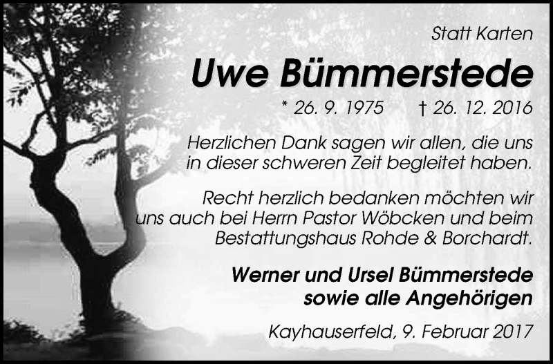 Hier finden Sie alle Traueranzeigen aus der Zeitung, die bisher für Uwe Bümmerstede erschienen sind. Weitere Traueranzeigen, die in der Zeitung erscheinen, werden hier ebenfalls aufgelistet