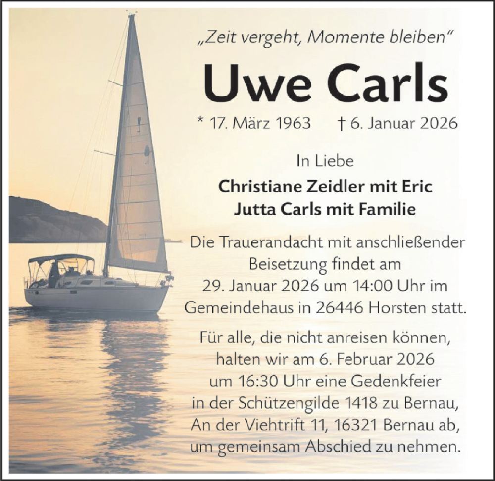 Hier finden Sie alle Traueranzeigen aus der Zeitung, die bisher für Uwe Carls erschienen sind. Weitere Traueranzeigen, die in der Zeitung erscheinen, werden hier ebenfalls aufgelistet
