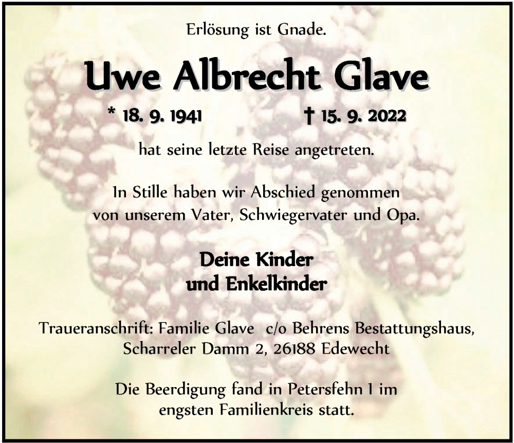 Hier finden Sie alle Traueranzeigen aus der Zeitung, die bisher für Uwe Glave erschienen sind. Weitere Traueranzeigen, die in der Zeitung erscheinen, werden hier ebenfalls aufgelistet
