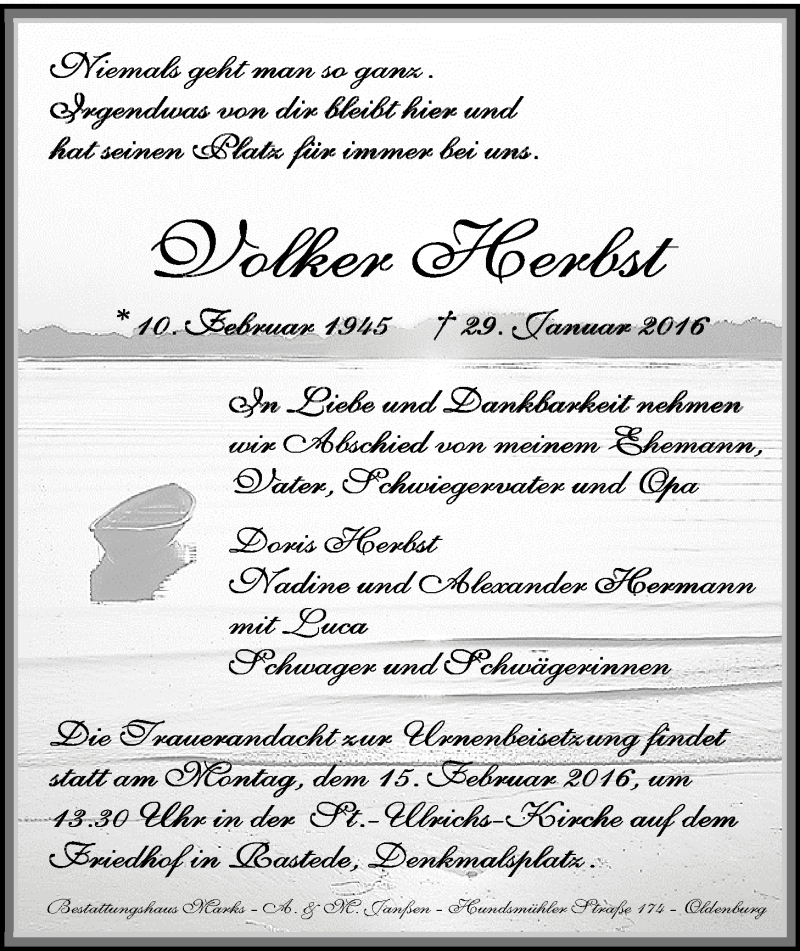 Hier finden Sie alle Traueranzeigen aus der Zeitung, die bisher für Volker Herbst erschienen sind. Weitere Traueranzeigen, die in der Zeitung erscheinen, werden hier ebenfalls aufgelistet