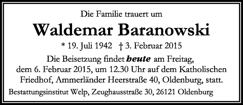 Hier finden Sie alle Traueranzeigen aus der Zeitung, die bisher für Waldemar Baranowski erschienen sind. Weitere Traueranzeigen, die in der Zeitung erscheinen, werden hier ebenfalls aufgelistet