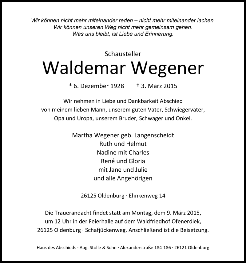 Hier finden Sie alle Traueranzeigen aus der Zeitung, die bisher für Waldemar Wegener erschienen sind. Weitere Traueranzeigen, die in der Zeitung erscheinen, werden hier ebenfalls aufgelistet