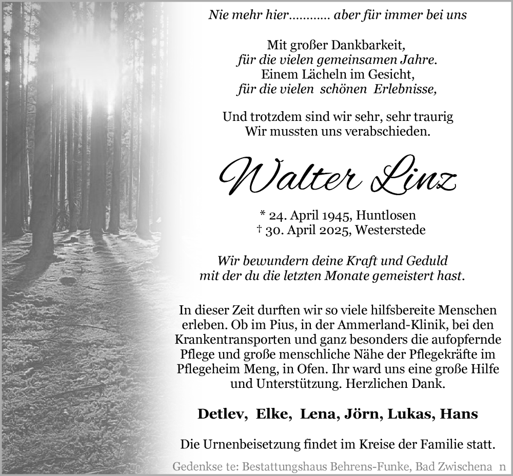 Hier finden Sie alle Traueranzeigen aus der Zeitung, die bisher für Walter Linz erschienen sind. Weitere Traueranzeigen, die in der Zeitung erscheinen, werden hier ebenfalls aufgelistet