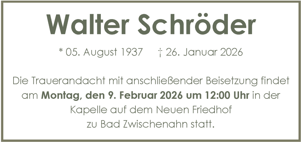 Hier finden Sie alle Traueranzeigen aus der Zeitung, die bisher für Walter Schröder erschienen sind. Weitere Traueranzeigen, die in der Zeitung erscheinen, werden hier ebenfalls aufgelistet