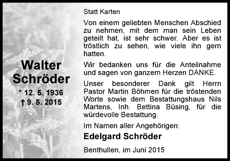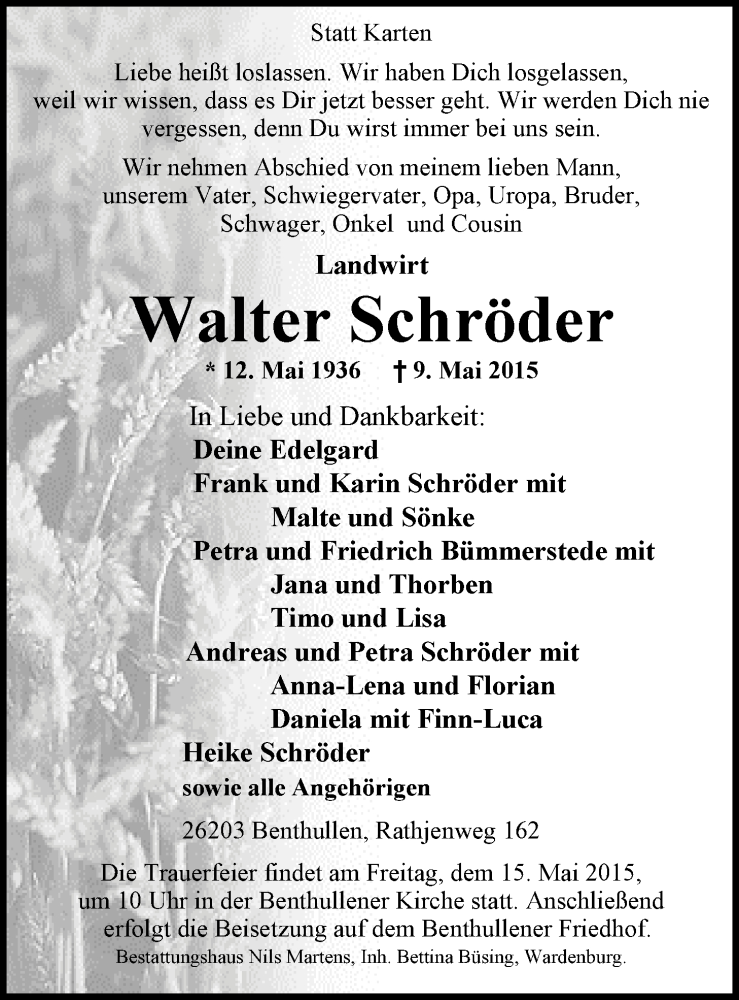 Hier finden Sie alle Traueranzeigen aus der Zeitung, die bisher für Walter Schröder erschienen sind. Weitere Traueranzeigen, die in der Zeitung erscheinen, werden hier ebenfalls aufgelistet