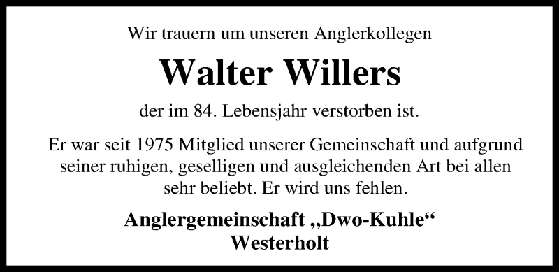 Hier finden Sie alle Traueranzeigen aus der Zeitung, die bisher für Walter Willers erschienen sind. Weitere Traueranzeigen, die in der Zeitung erscheinen, werden hier ebenfalls aufgelistet