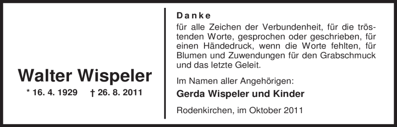 Hier finden Sie alle Traueranzeigen aus der Zeitung, die bisher für Walter Wispeler erschienen sind. Weitere Traueranzeigen, die in der Zeitung erscheinen, werden hier ebenfalls aufgelistet