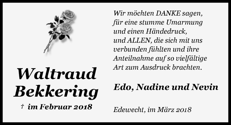 Hier finden Sie alle Traueranzeigen aus der Zeitung, die bisher für Waltraud Bekkering erschienen sind. Weitere Traueranzeigen, die in der Zeitung erscheinen, werden hier ebenfalls aufgelistet