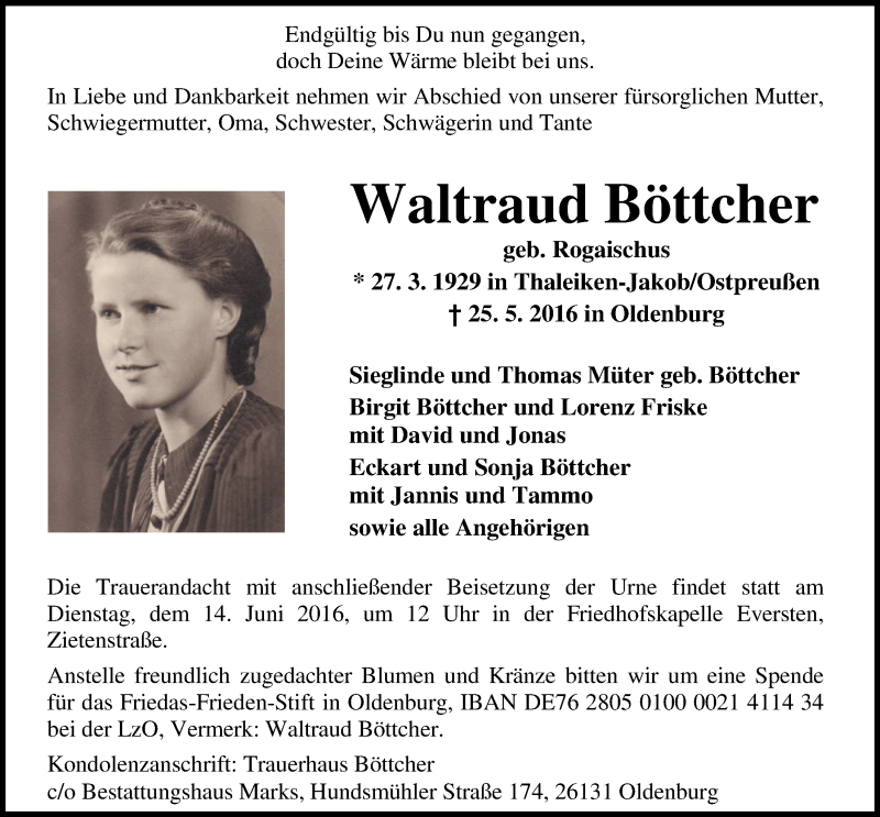 Hier finden Sie alle Traueranzeigen aus der Zeitung, die bisher für Waltraud Böttcher erschienen sind. Weitere Traueranzeigen, die in der Zeitung erscheinen, werden hier ebenfalls aufgelistet