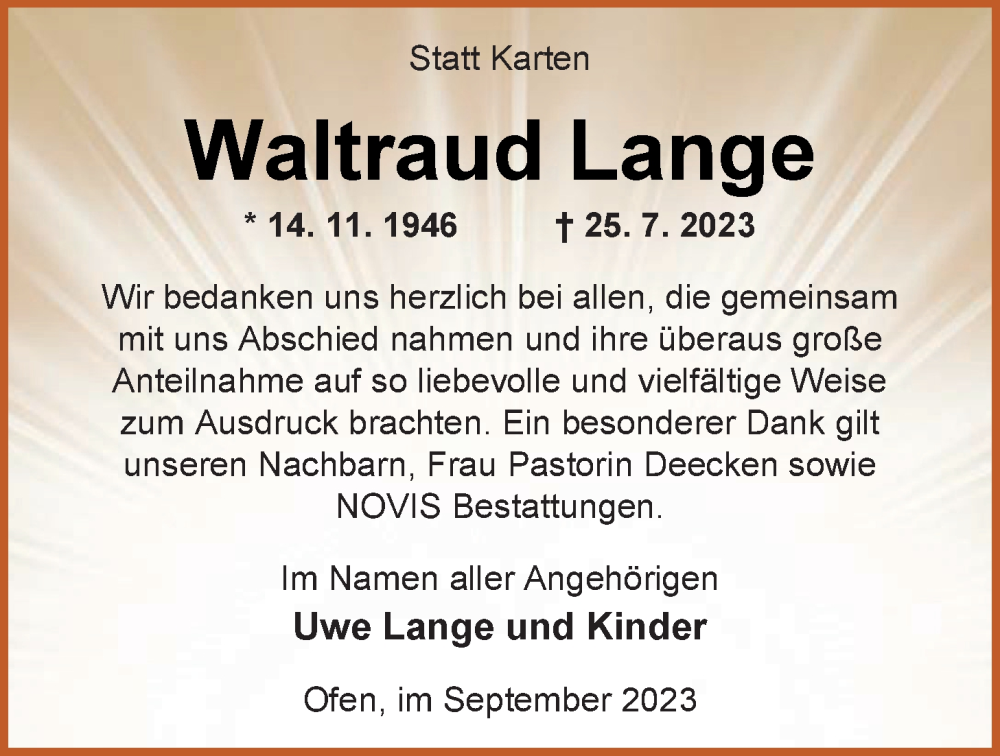 Hier finden Sie alle Traueranzeigen aus der Zeitung, die bisher für Waltraud Lange erschienen sind. Weitere Traueranzeigen, die in der Zeitung erscheinen, werden hier ebenfalls aufgelistet