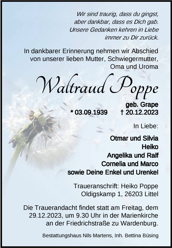 Hier finden Sie alle Traueranzeigen aus der Zeitung, die bisher für Waltraud Poppe erschienen sind. Weitere Traueranzeigen, die in der Zeitung erscheinen, werden hier ebenfalls aufgelistet