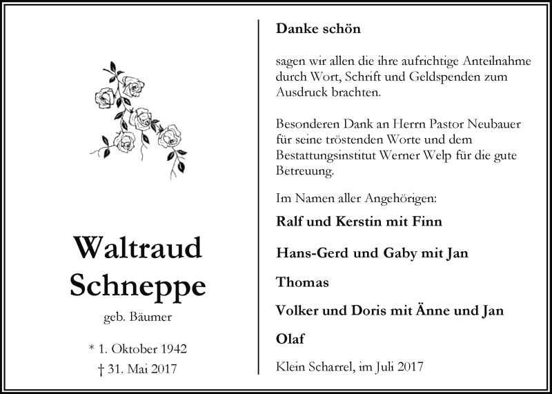 Hier finden Sie alle Traueranzeigen aus der Zeitung, die bisher für Waltraud Schneppe erschienen sind. Weitere Traueranzeigen, die in der Zeitung erscheinen, werden hier ebenfalls aufgelistet