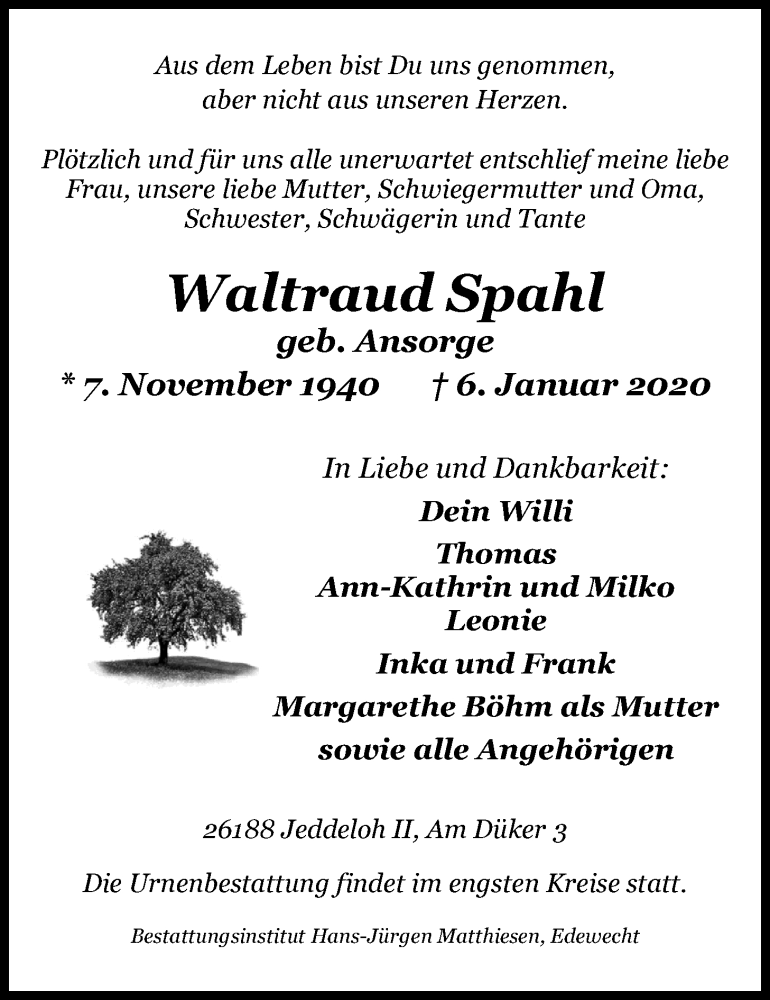 Hier finden Sie alle Traueranzeigen aus der Zeitung, die bisher für Waltraud Spahl erschienen sind. Weitere Traueranzeigen, die in der Zeitung erscheinen, werden hier ebenfalls aufgelistet
