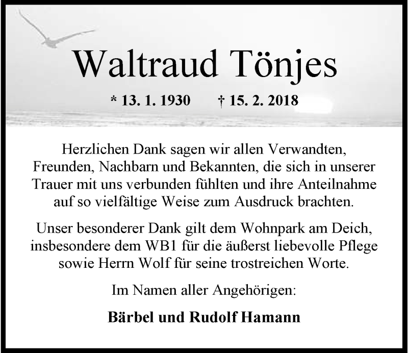 Hier finden Sie alle Traueranzeigen aus der Zeitung, die bisher für Waltraud Tönjes erschienen sind. Weitere Traueranzeigen, die in der Zeitung erscheinen, werden hier ebenfalls aufgelistet