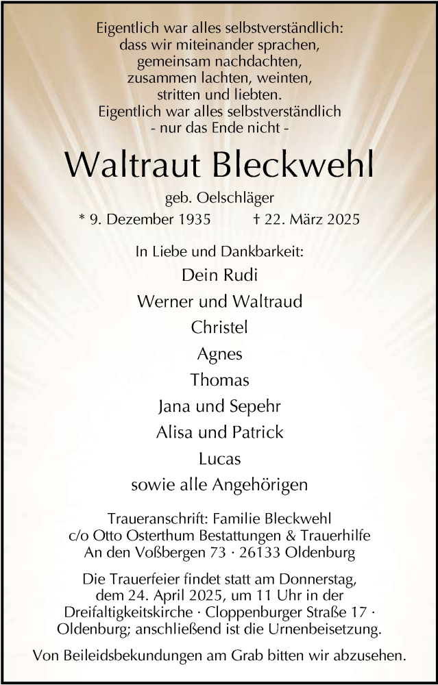 Hier finden Sie alle Traueranzeigen aus der Zeitung, die bisher für Waltraut Bleckwehl erschienen sind. Weitere Traueranzeigen, die in der Zeitung erscheinen, werden hier ebenfalls aufgelistet