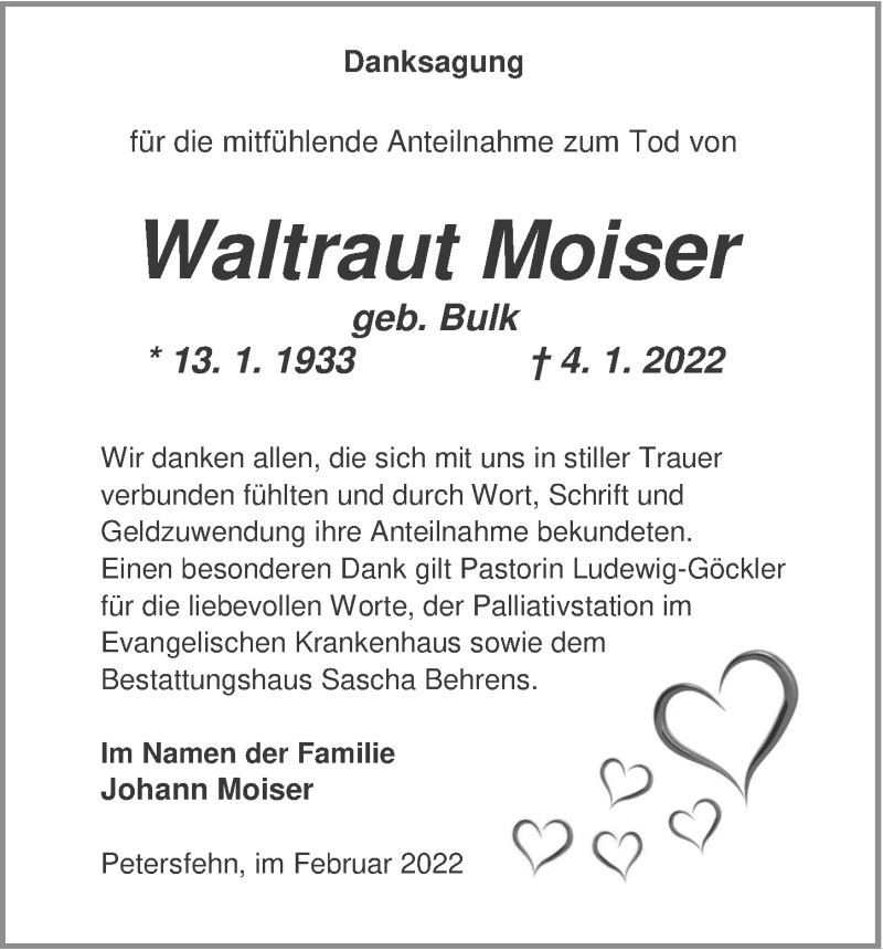 Hier finden Sie alle Traueranzeigen aus der Zeitung, die bisher für Waltraut Moiser erschienen sind. Weitere Traueranzeigen, die in der Zeitung erscheinen, werden hier ebenfalls aufgelistet
