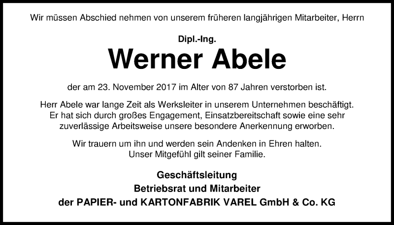 Hier finden Sie alle Traueranzeigen aus der Zeitung, die bisher für Werner Abele erschienen sind. Weitere Traueranzeigen, die in der Zeitung erscheinen, werden hier ebenfalls aufgelistet