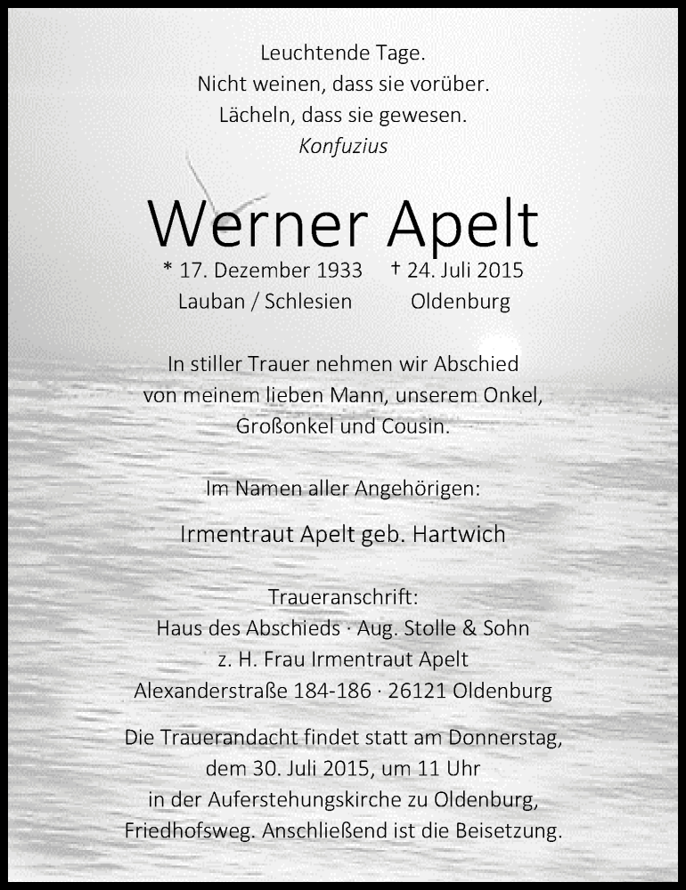 Hier finden Sie alle Traueranzeigen aus der Zeitung, die bisher für Werner Apelt erschienen sind. Weitere Traueranzeigen, die in der Zeitung erscheinen, werden hier ebenfalls aufgelistet