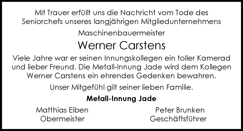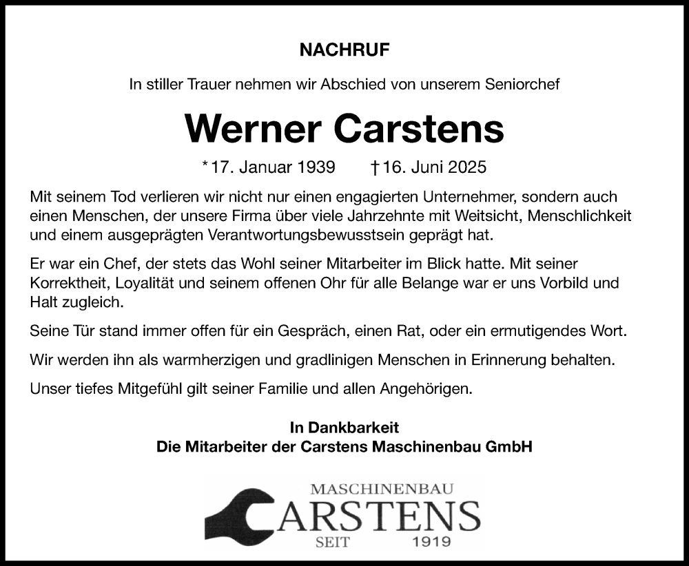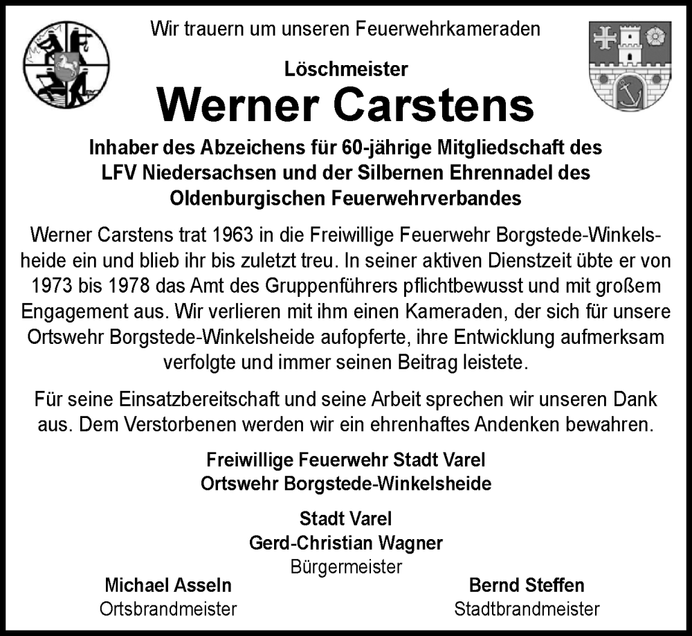 Hier finden Sie alle Traueranzeigen aus der Zeitung, die bisher für Werner Carstens erschienen sind. Weitere Traueranzeigen, die in der Zeitung erscheinen, werden hier ebenfalls aufgelistet