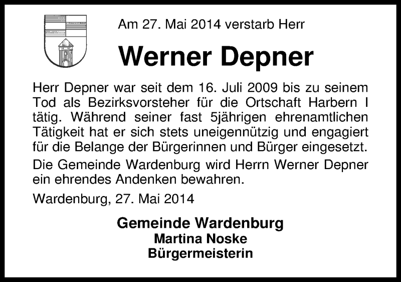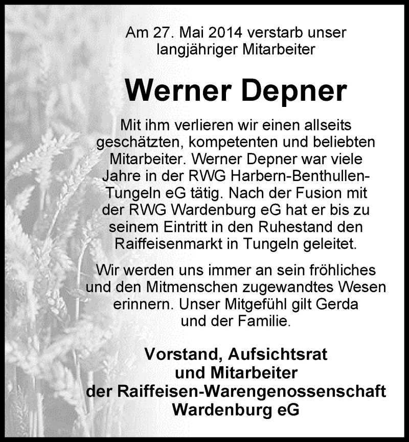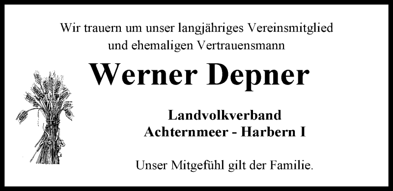 Hier finden Sie alle Traueranzeigen aus der Zeitung, die bisher für Werner Depner erschienen sind. Weitere Traueranzeigen, die in der Zeitung erscheinen, werden hier ebenfalls aufgelistet