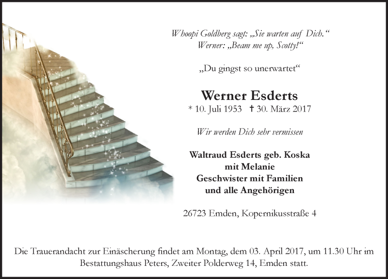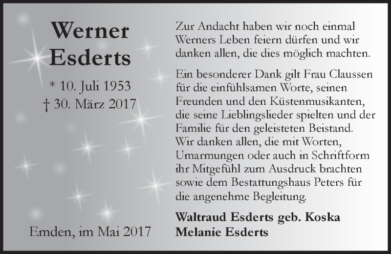 Hier finden Sie alle Traueranzeigen aus der Zeitung, die bisher für Werner Esderts erschienen sind. Weitere Traueranzeigen, die in der Zeitung erscheinen, werden hier ebenfalls aufgelistet