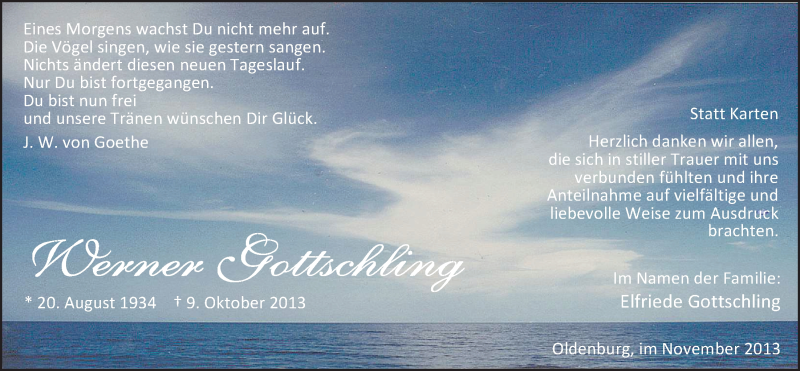 Hier finden Sie alle Traueranzeigen aus der Zeitung, die bisher für Werner Gottschling erschienen sind. Weitere Traueranzeigen, die in der Zeitung erscheinen, werden hier ebenfalls aufgelistet