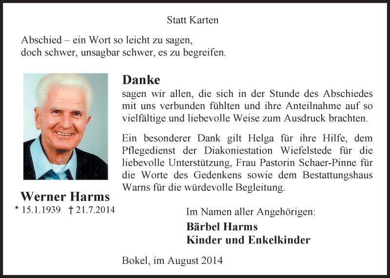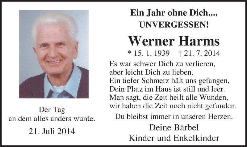 Hier finden Sie alle Traueranzeigen aus der Zeitung, die bisher für Werner Harms erschienen sind. Weitere Traueranzeigen, die in der Zeitung erscheinen, werden hier ebenfalls aufgelistet