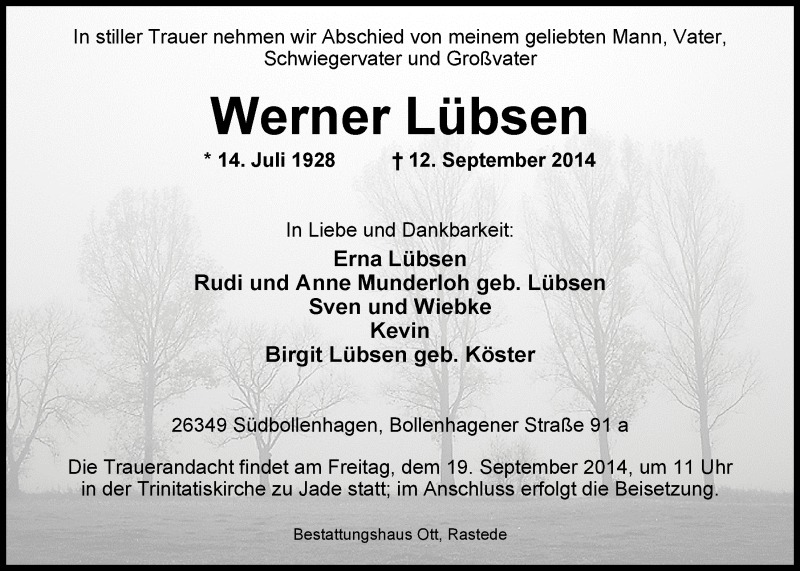 Hier finden Sie alle Traueranzeigen aus der Zeitung, die bisher für Werner Lübsen erschienen sind. Weitere Traueranzeigen, die in der Zeitung erscheinen, werden hier ebenfalls aufgelistet