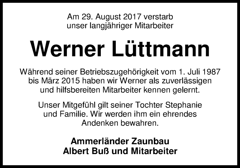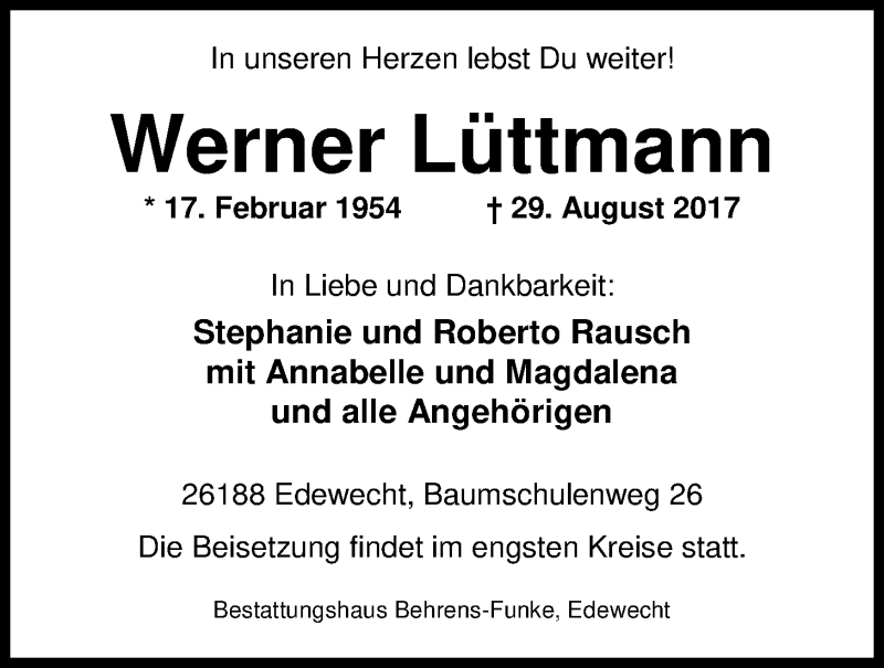 Hier finden Sie alle Traueranzeigen aus der Zeitung, die bisher für Werner Lüttmann erschienen sind. Weitere Traueranzeigen, die in der Zeitung erscheinen, werden hier ebenfalls aufgelistet