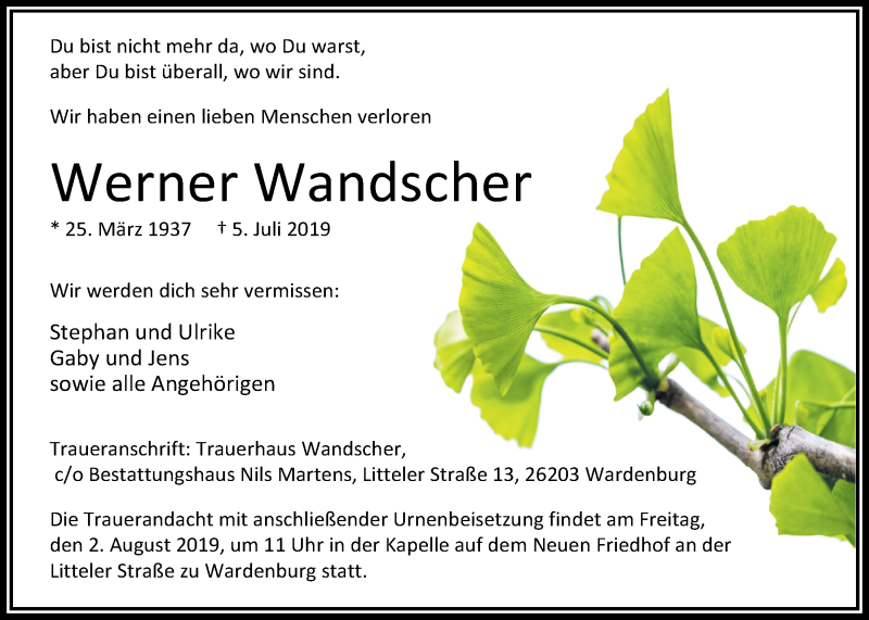 Hier finden Sie alle Traueranzeigen aus der Zeitung, die bisher für Werner Wandscher erschienen sind. Weitere Traueranzeigen, die in der Zeitung erscheinen, werden hier ebenfalls aufgelistet