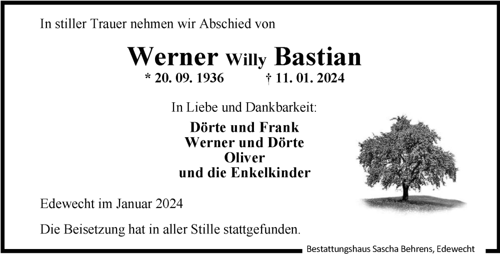 Hier finden Sie alle Traueranzeigen aus der Zeitung, die bisher für Werner Willy Bastian erschienen sind. Weitere Traueranzeigen, die in der Zeitung erscheinen, werden hier ebenfalls aufgelistet