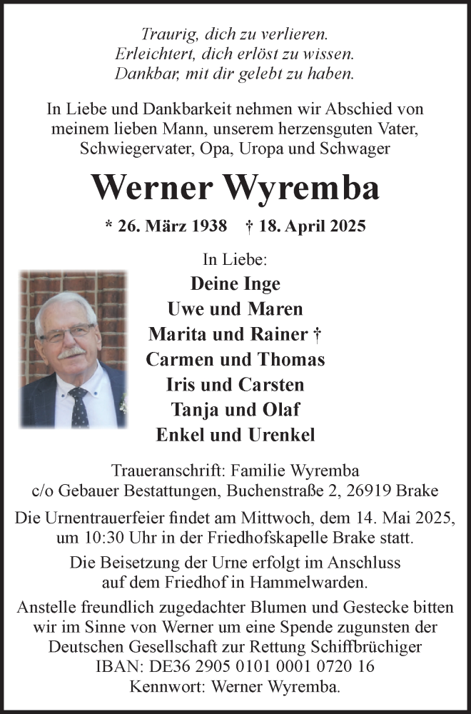 Hier finden Sie alle Traueranzeigen aus der Zeitung, die bisher für Werner Wyremba erschienen sind. Weitere Traueranzeigen, die in der Zeitung erscheinen, werden hier ebenfalls aufgelistet